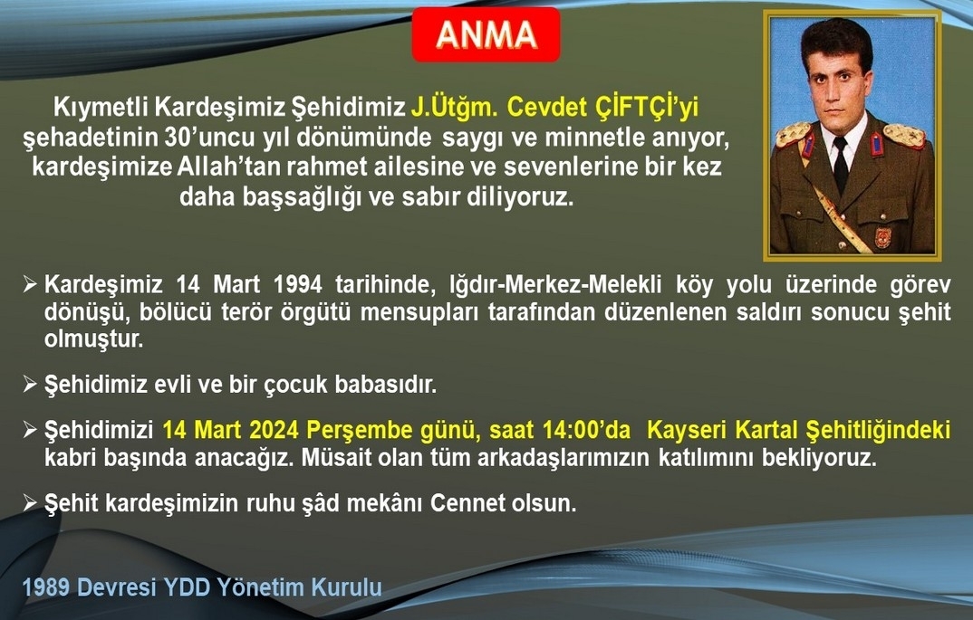 Kıymetli Kardeşimiz Şehidimiz J.Ütğm. Cevdet ÇİFTÇİ’yi şehadetinin 30’uncu yıl dönümünde, Kayseri Kartal Şehitliğindeki kabri başında Dernek Yönetimi ve ailesinin katılımıyla saygı, minnet ve dua ile andık.