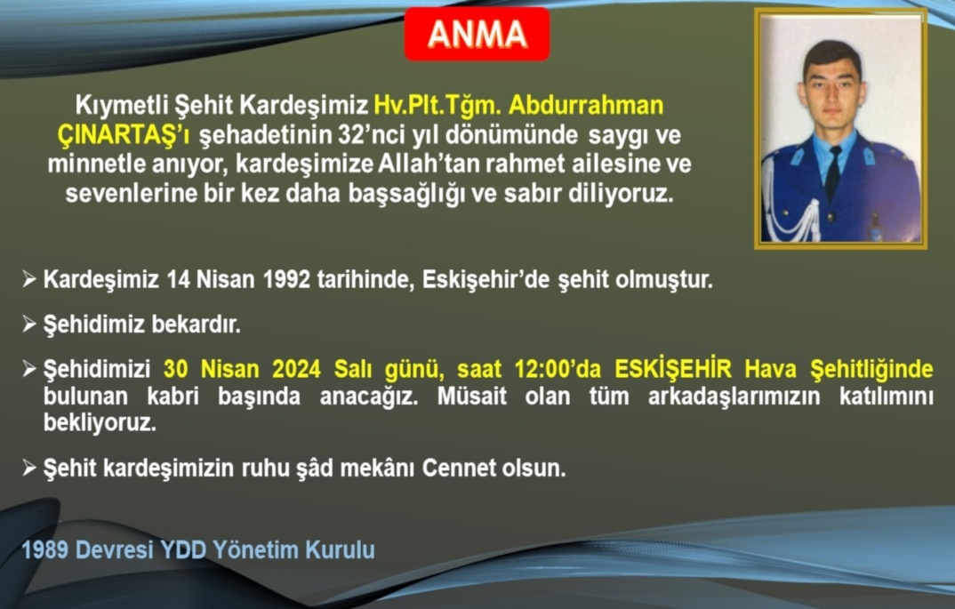 Kıymetli Şehit Kardeşimiz Hv.Plt.Tğm. Abdurrahman ÇINARTAŞ’ı şehadetinin 32’nci yıl dönümünde, Eşkişehir Hava Şehitliğinde bulunan kabri başında Dernek Yönetimi ve devre arkadaşlarımızın katılımıyla saygı, minnet ve dua ile andık. Katılan, destek veren herkese teşekkür ediyoruz. Şehit kardeşimizin ruhu şâd mekânı Cennet olsun.