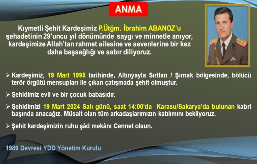 Kıymetli Şehit Kardeşimiz P.Ütğm. İbrahim ABANOZ’u şehadetinin 29’uncu yıl dönümünde, Karasu/Sakarya’da bulunan kabri başında Dernek Yönetimi, devre arkadaşlarımız, sevenleri ve adını taşıyan okulun öğrencilerinin katılımıyla saygı, minnet ve dua ile andık.